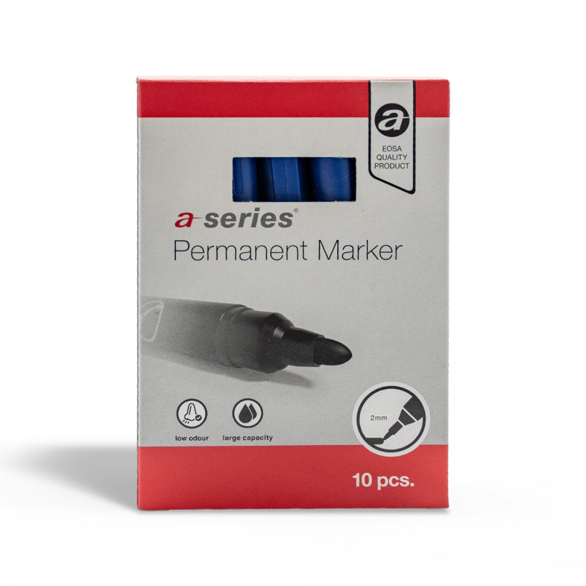"Műanyag, üveg, fém, fa, illetve szinte minden felület feliratozására, jelölésére alkalmas, alkoholbázisú festékkel töltött permanent marker vastag írócsúccsal. A kerekített csúcs vonalvastagsága: 3 mm. Írásképe gyorsan száradó, vízálló, fény- és kopásálló. Írásképe vízálló, kerek csúccsal és légmentesen záró kupakkal. Test színe fehér, az írásszín egyértelmű megjelölésével. 10db/doboz, 600db/gyűjtő " Katalóguskód: 63780