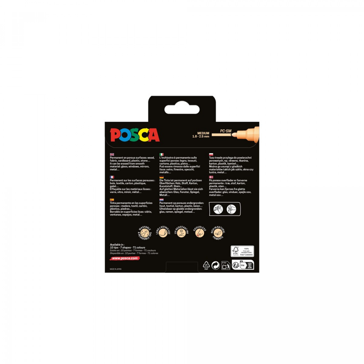 A POSCA vízbázisú markerek szinte minden felületen használhatóak. Tartós vagy félig tartós eredményt biztosít a felületektől függően. Festéke pigmentekben gazdag, egyedülállóan telt színek jellemzik, amelyek ellenállnak az idő múlásának. A vízbázisú festék szagtalan, rétegezhető, keverhető és vízben oldódó. A POSCA markerek tökéletes eszközt jelentenek művészeknek, grafikusoknak, designereknek és lényegében bárkinek kreatív tevékenységekhez.