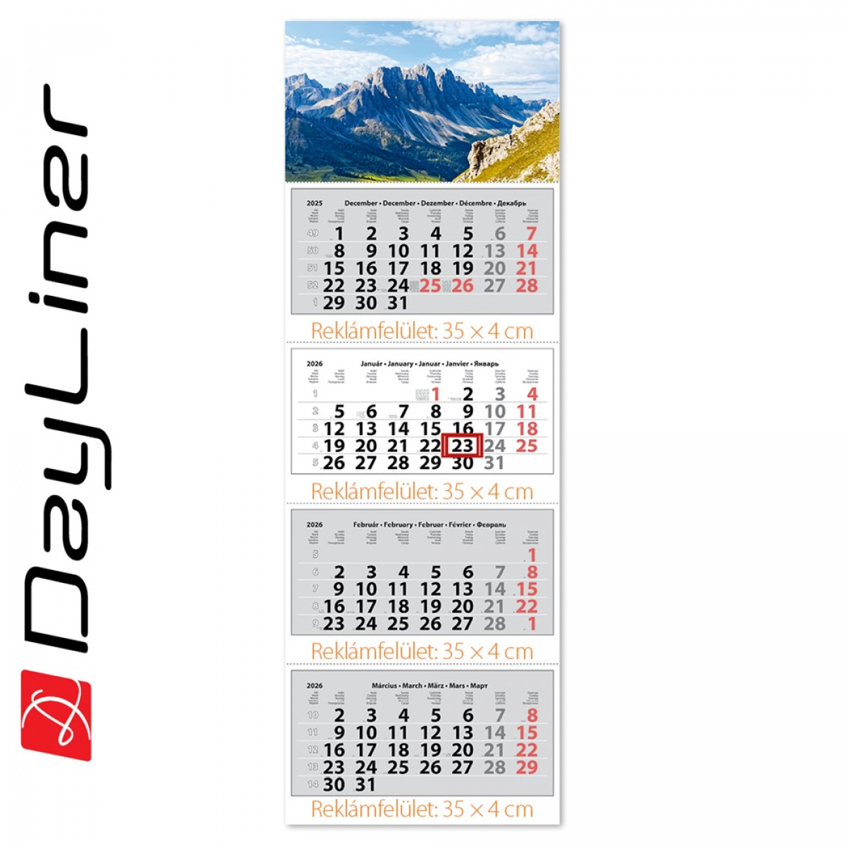 Speditőr naptár 4 tömb, 4 hónap Szuper Maxi 350 × 1025 mm, fehér lapokkal Hegy Dayliner 2026. bemutatása